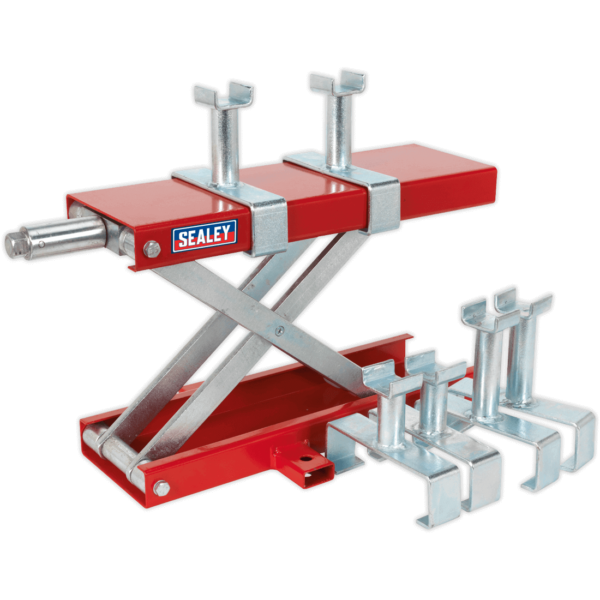 Scissor support stand suitable for use either on a motorcycle lift or on the floor. Supplied with sliding pin carriers and three pairs of support pins. Raise with a 22mm spanner/socket. Features & Benefits: • Scissor support stand suitable…