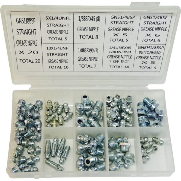 The Lumatic Selection Box contains 80 of the most popular metric grease nipples. The fittings are case hardened and plated, ZN3 zinc and clear, head forms conform to DIN 71412. Supplied in a handy clear case with labelled sections for easy …